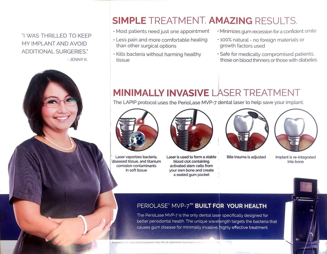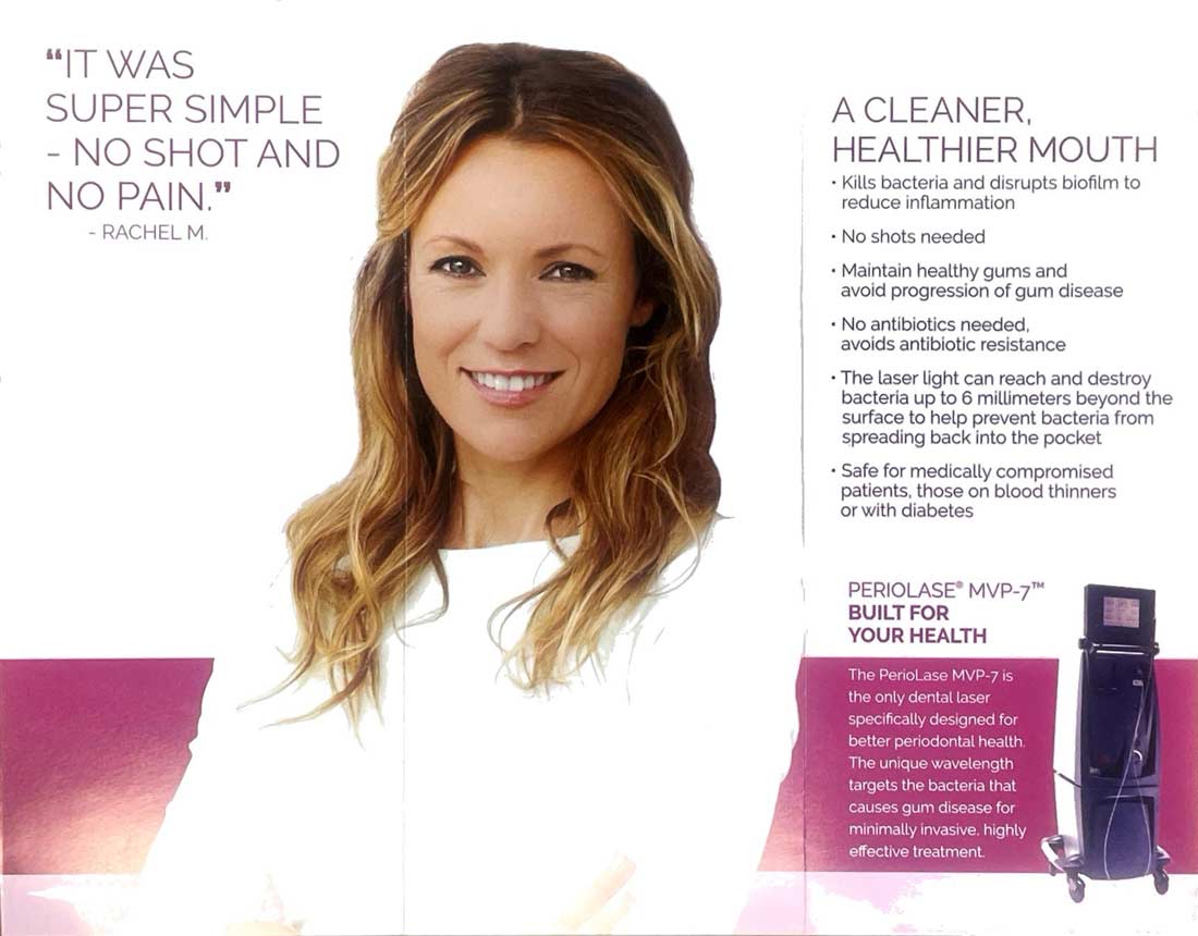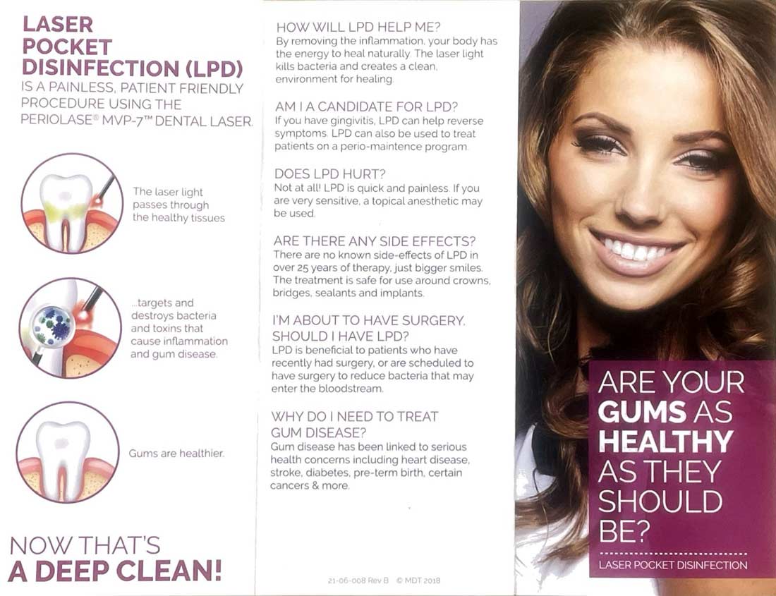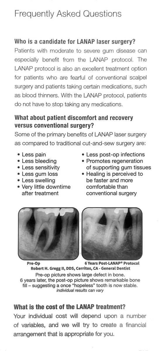 A. One of the greatest benefits of laser treatment is that it eliminates or reduces fear and dental anxiety associated with oral surgery. Patients are put on a local anesthetic and typically recover within the first 24 hours, reducing time requested off work or school. Another benefit is LANAP laser treatment can be done in patients with moderate to severe periodontal disease, reducing the risk of tooth extraction, tooth loss, and other complications.