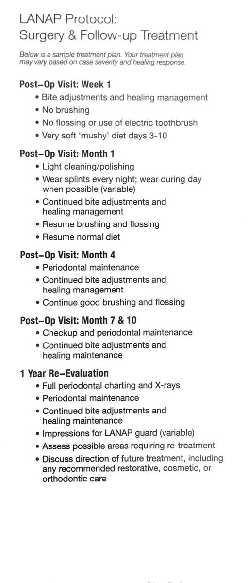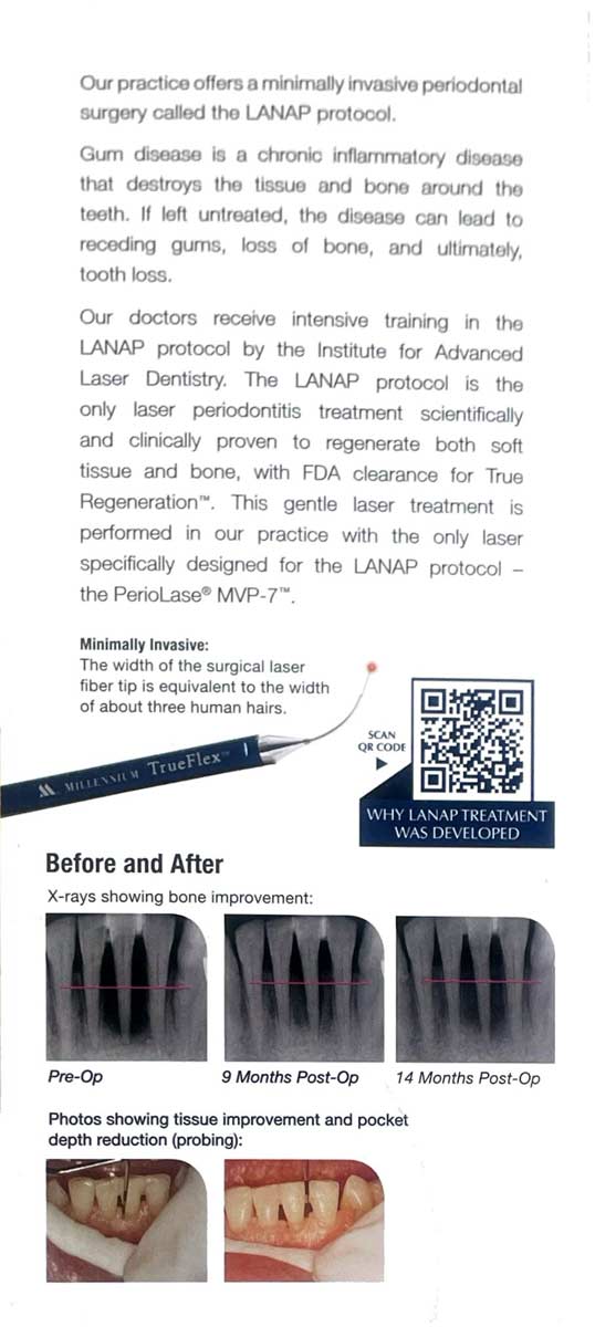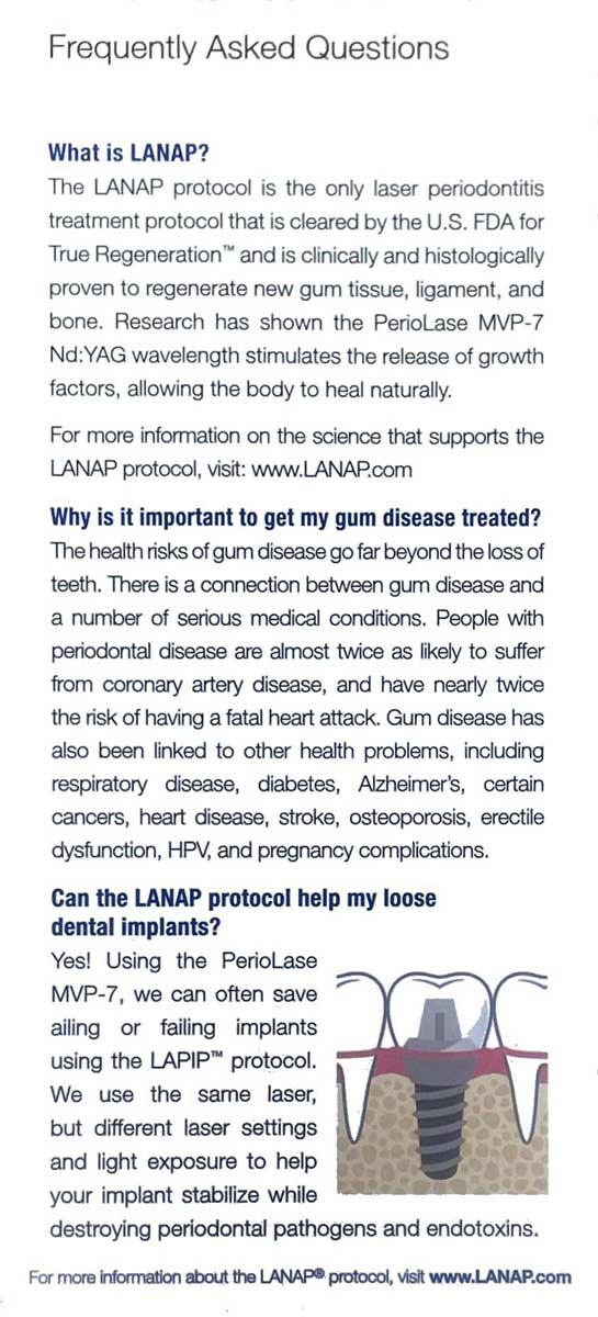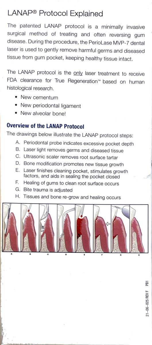 A. The LANAP protocol, or laser-assisted new attachment procedure, is a non-invasive gum treatment involving the removal of decay and infection caused by gum disease. It gently and quickly removes the disease from around, between, and underneath the teeth into the tooth roots and gums. There is only one type of LANAP laser treatment available to date.